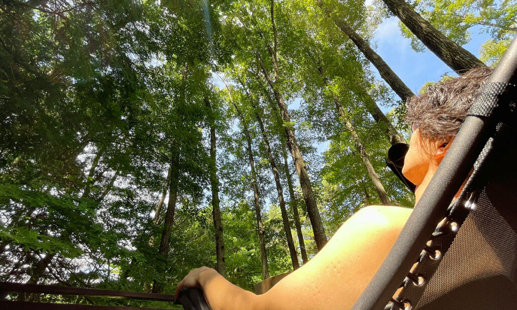 ナラやヒノキ林からの木漏れ日が降りそそぐ外気浴デッキが、ここでしか味わえない「ととのい空間」をご提供します。