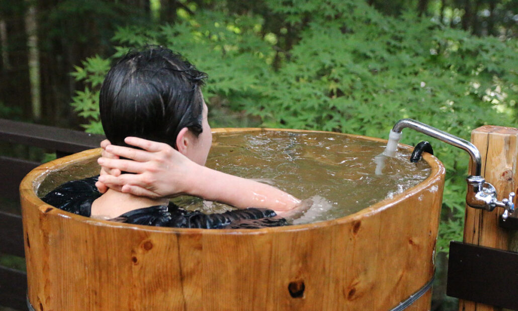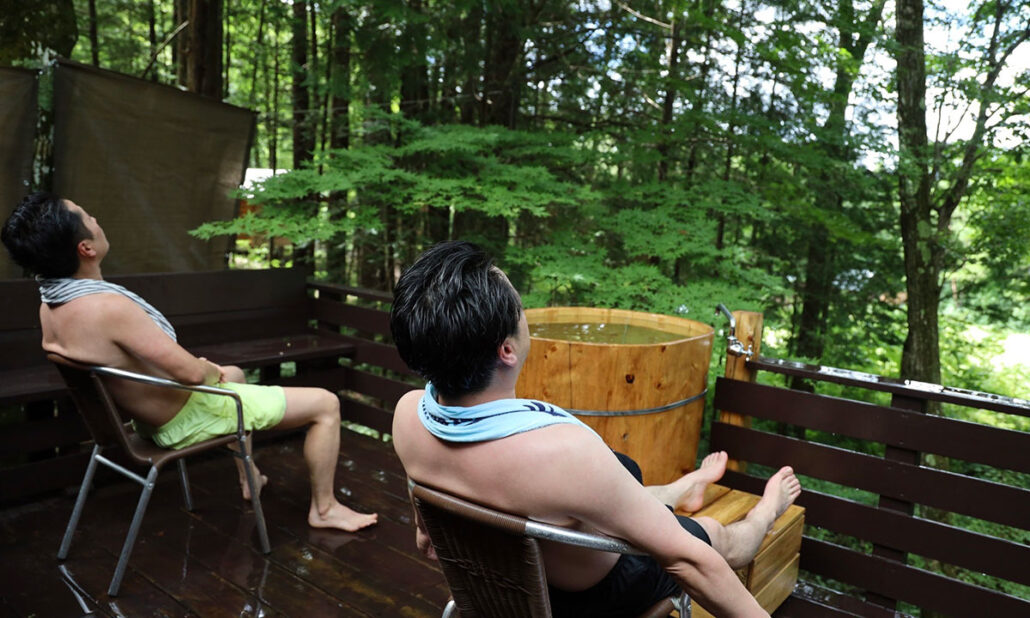 6名様まで利用できる完全貸切サウナは、ヒノキ林に囲まれ木曽駒ケ岳の天然水を引き込んだ最高のロケーションです。